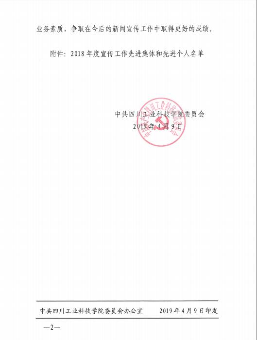 中共四川工业科技学院委员会关于表彰2018年度宣传工作先进集体和先进个人的通报