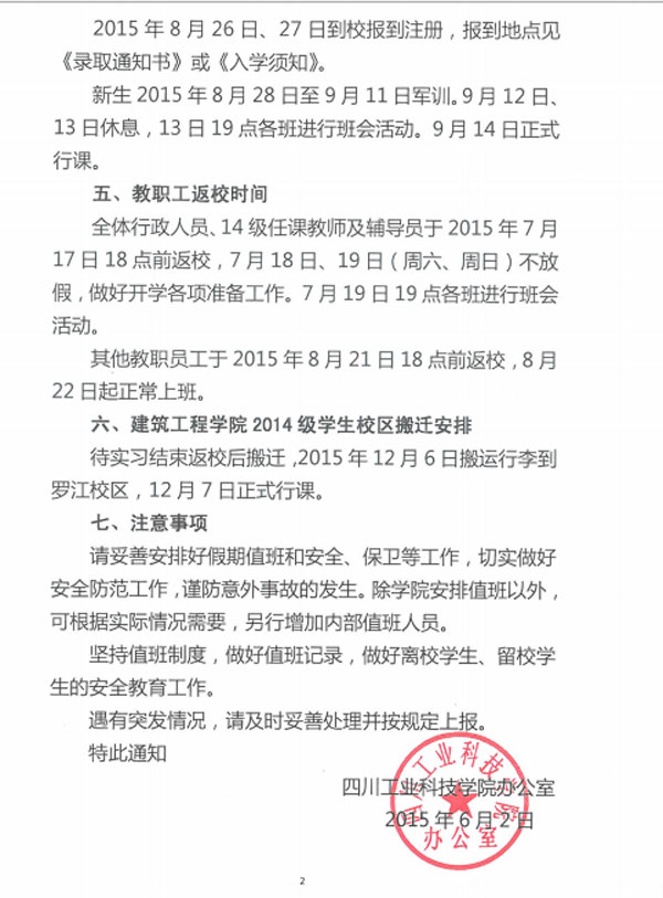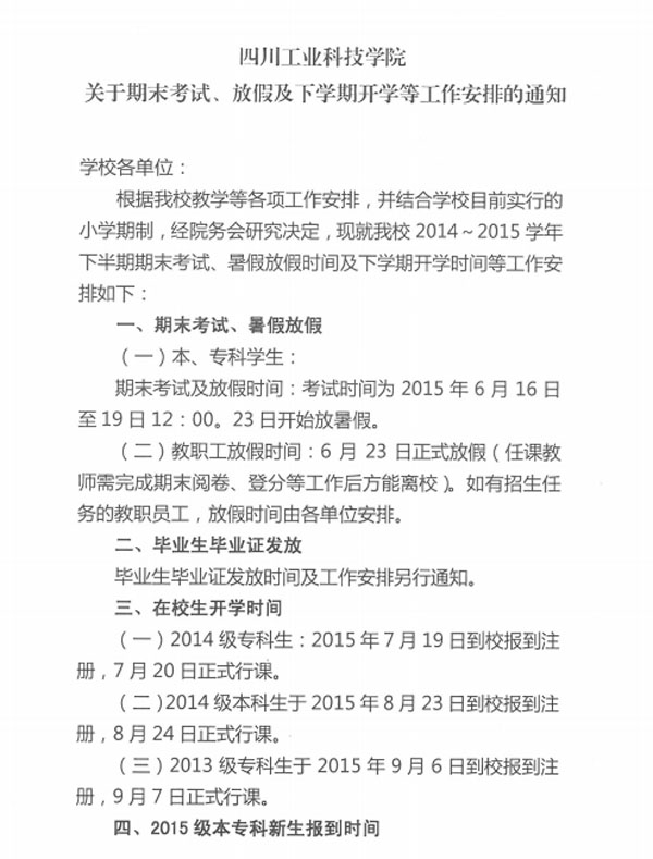 四川工业科技学院关于期末考试、放假及下学期开学等工作安排的通知