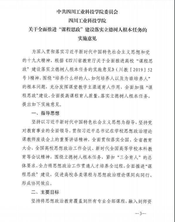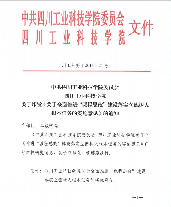 中共四川工业科技学院委员会四川工业科技学院关于印发《关于全面推进“课程思政”建设落实立德树人根本任务的实施意见》的通知