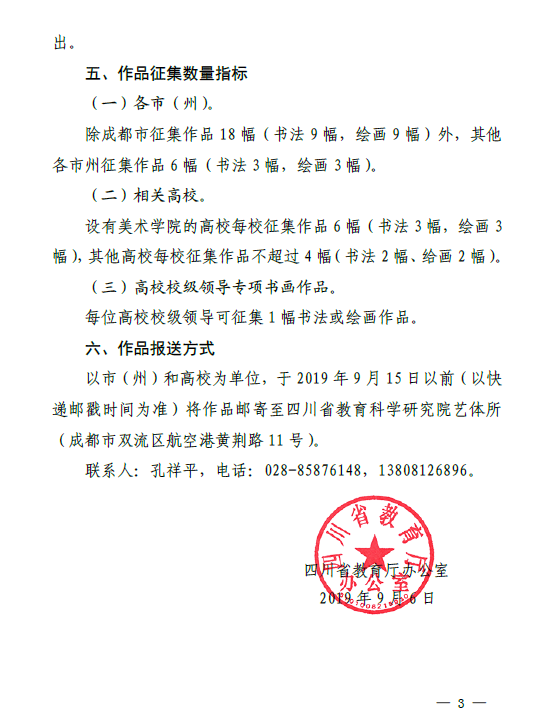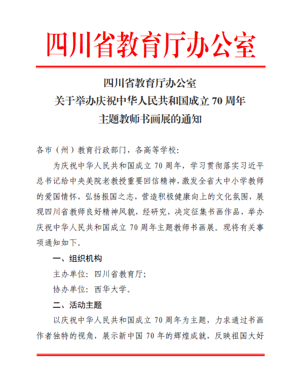 四川省教育厅办公室关于举办庆祝中华人民共和国成立70周年主题教师书画展的通知