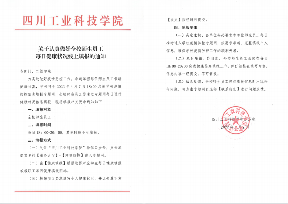 四川工业科技学院关于认真做好全校师生员工每日健康状况线上填报的通知