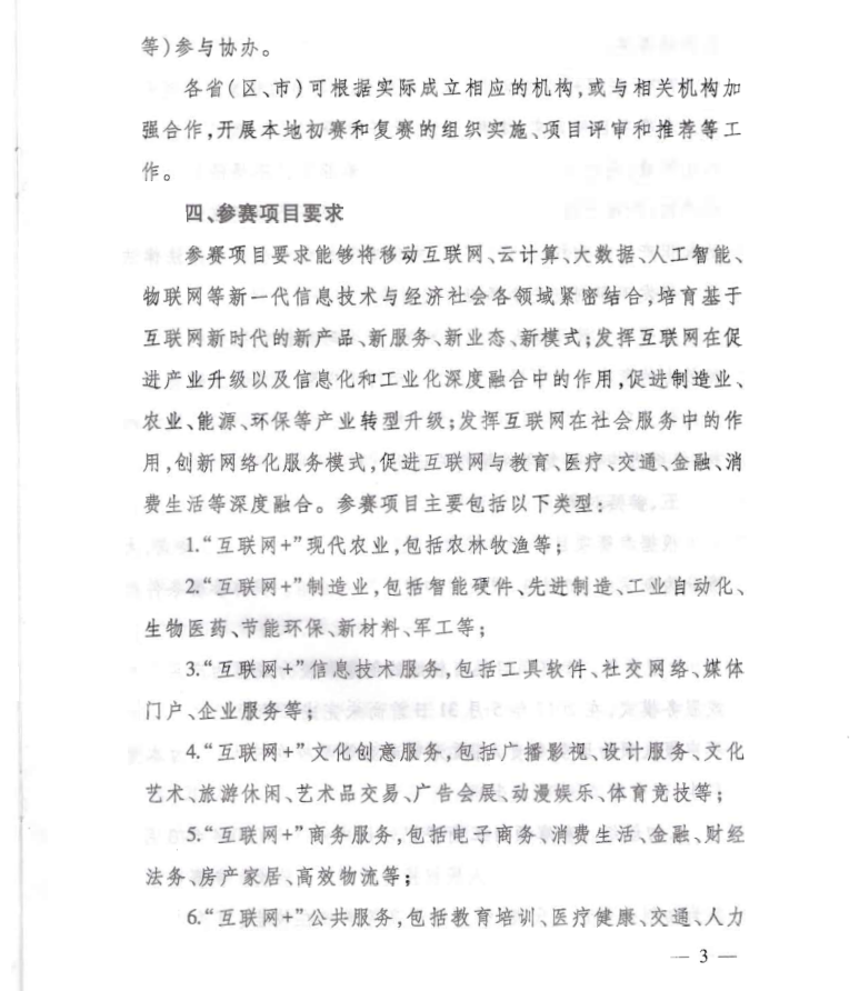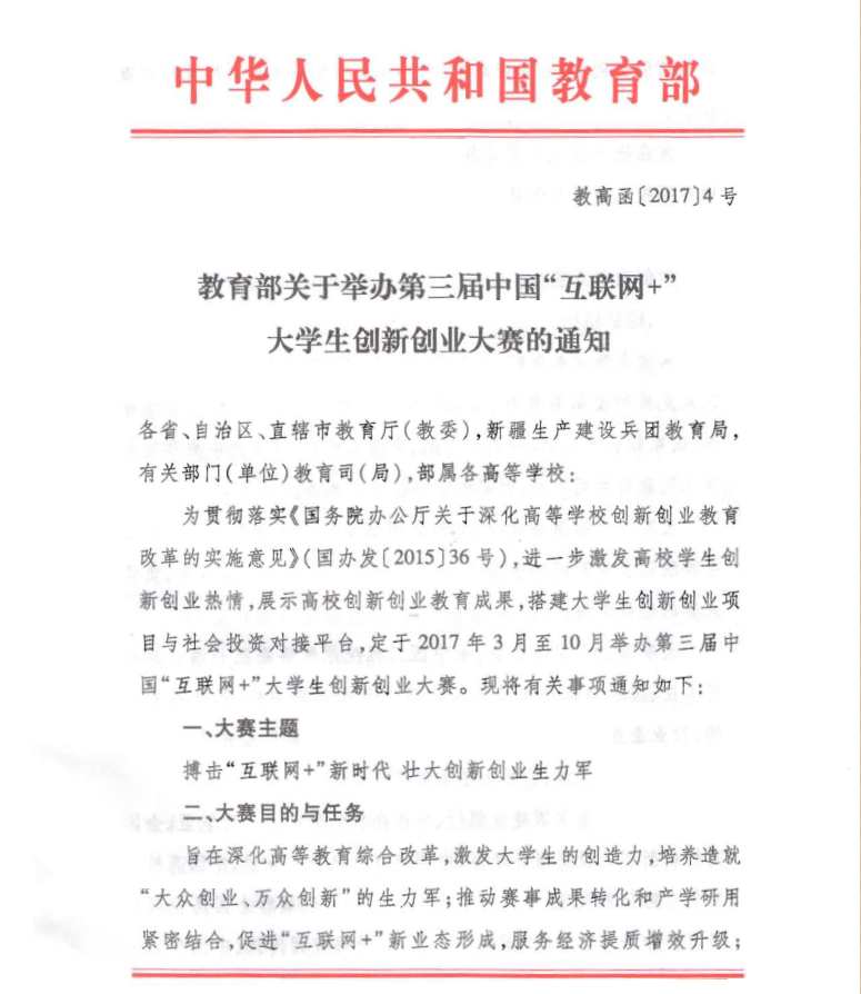 教育部关于举办第三届中国"互联网+" 大学生创新创业大赛的通知