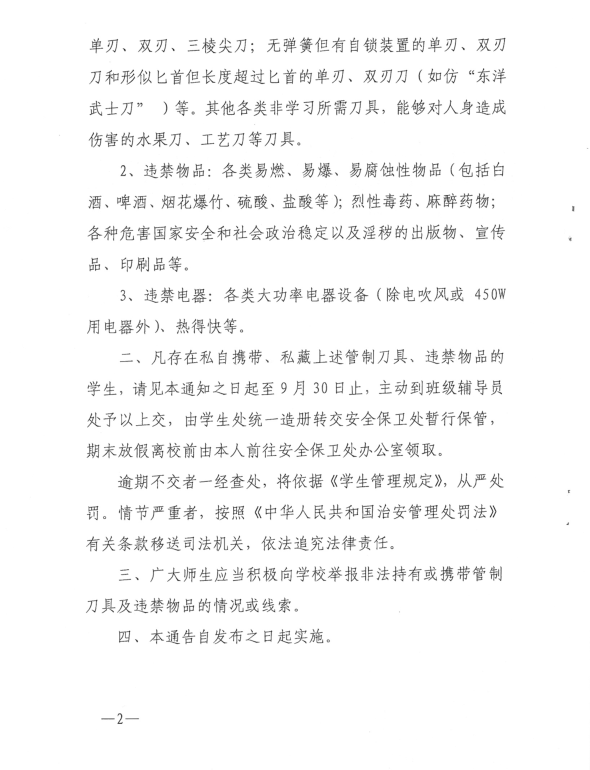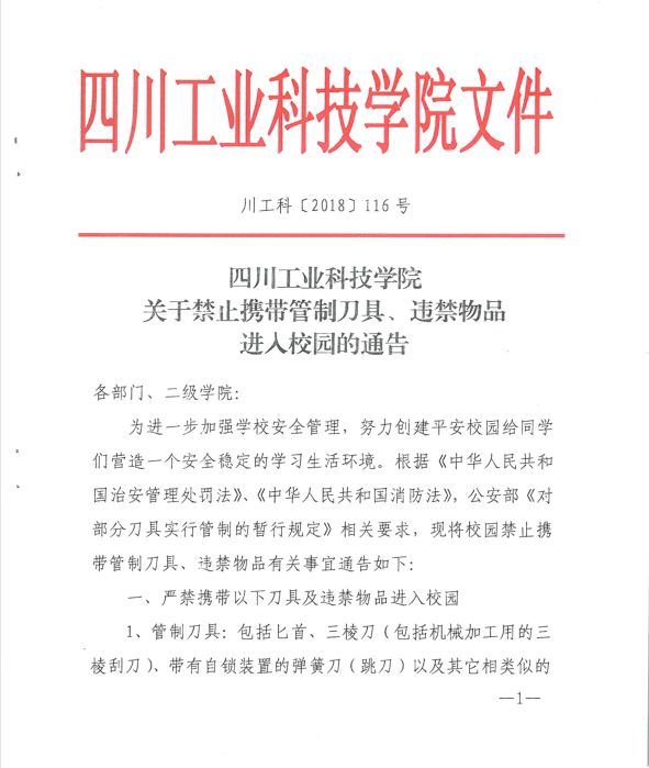 四川工业科技学院关于禁止携带管制刀具、违禁物品进入校园的通告