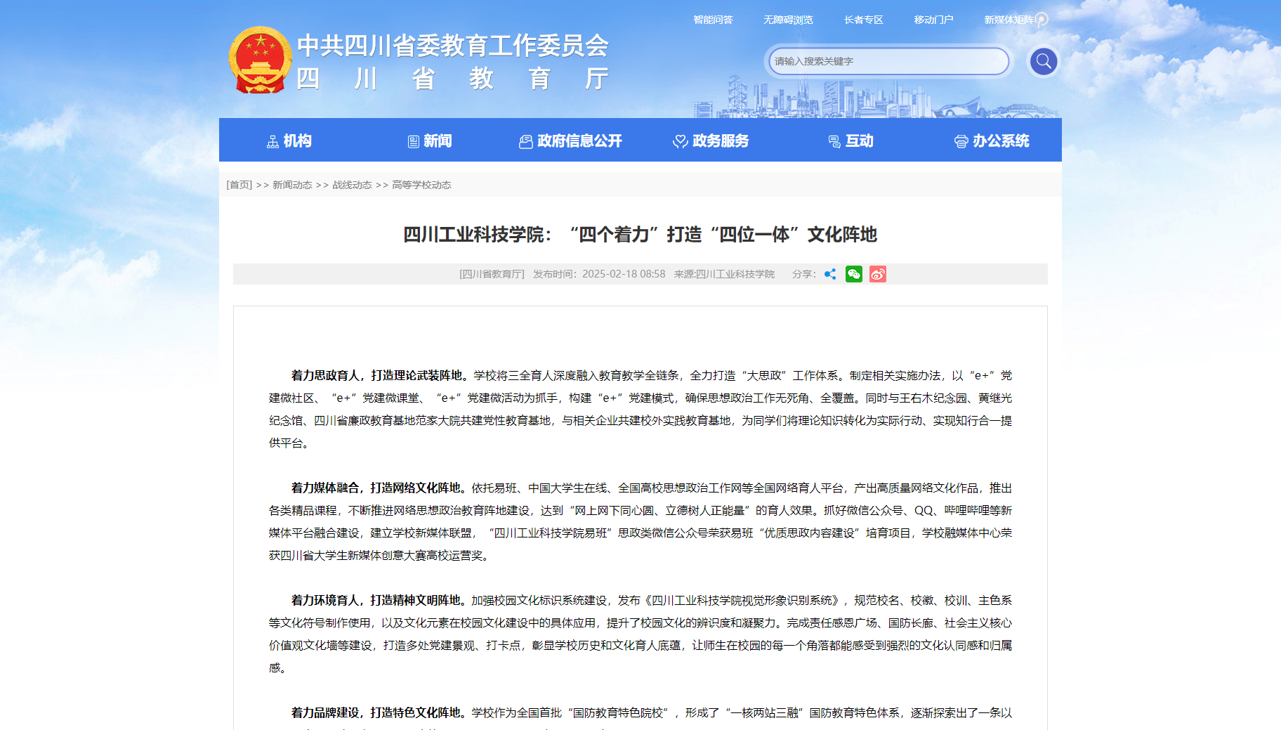 着力媒体融合,打造网络文化阵地。依托易班、中国大学生在线、全国高校思想政治工作网等全国网络育人平台,产出高质量网络文化作品,推出各类精品课程,不断推进网络思想政治教育阵地建设,达到“网上网下同心圆、立德树人正能量”的育人效果。抓好微信公众号、QQ、哔哩哔哩等新媒体平台融合建设,建立学校新媒体联盟,“四川工业科技学院易班”思政类微信公众号荣获易班“优质思政内容建设”培育项目,学校融媒体中心荣获四川省大学生新媒体创意大赛高校运营奖。