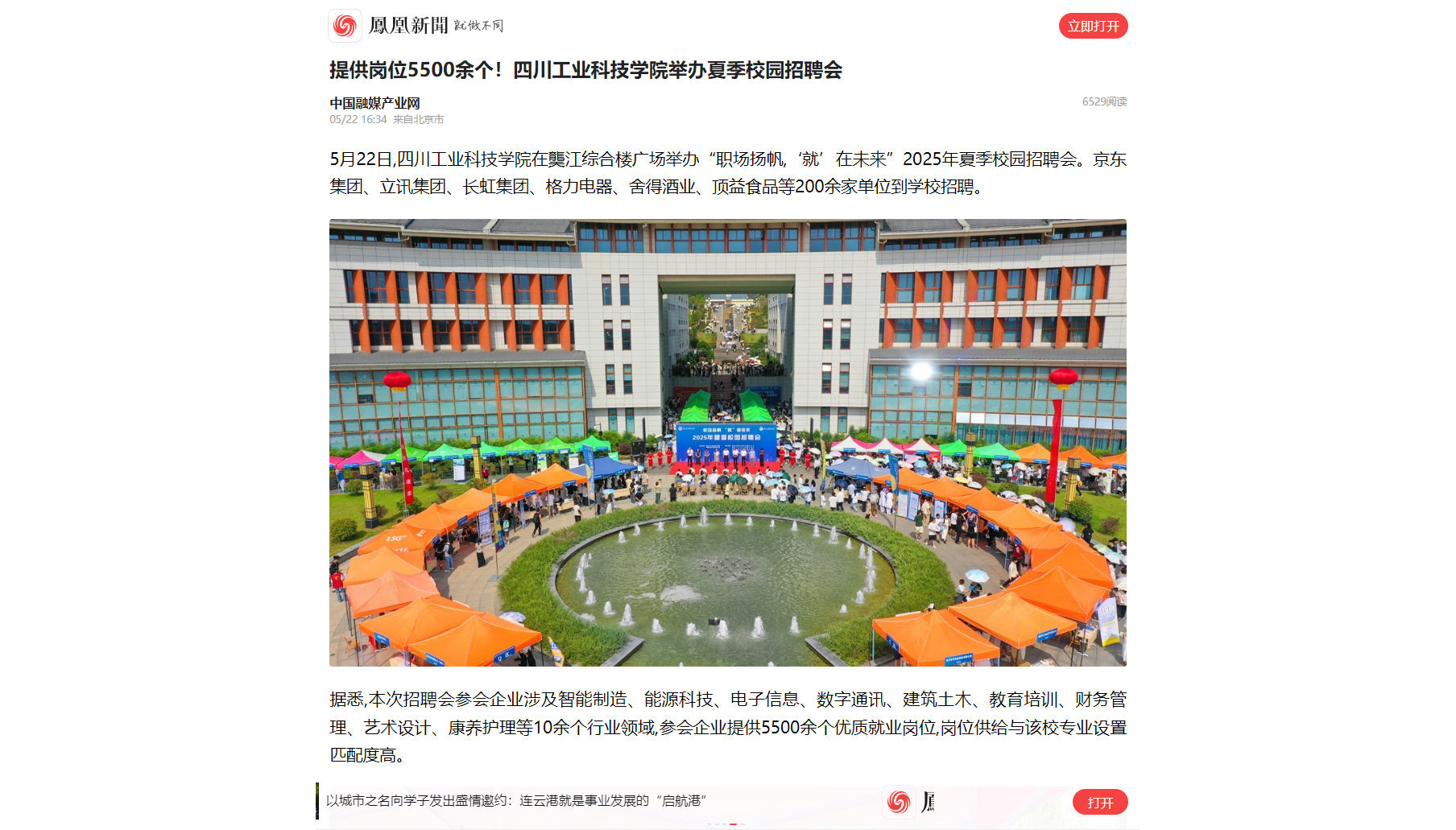 5月22日,四川工业科技学院在龑江综合楼广场举办“职场扬帆,‘就’在未来”2025年夏季校园招聘会。京东集团、立讯集团、长虹集团、格力电器、舍得酒业、顶益食品等200余家单位到学校招聘。