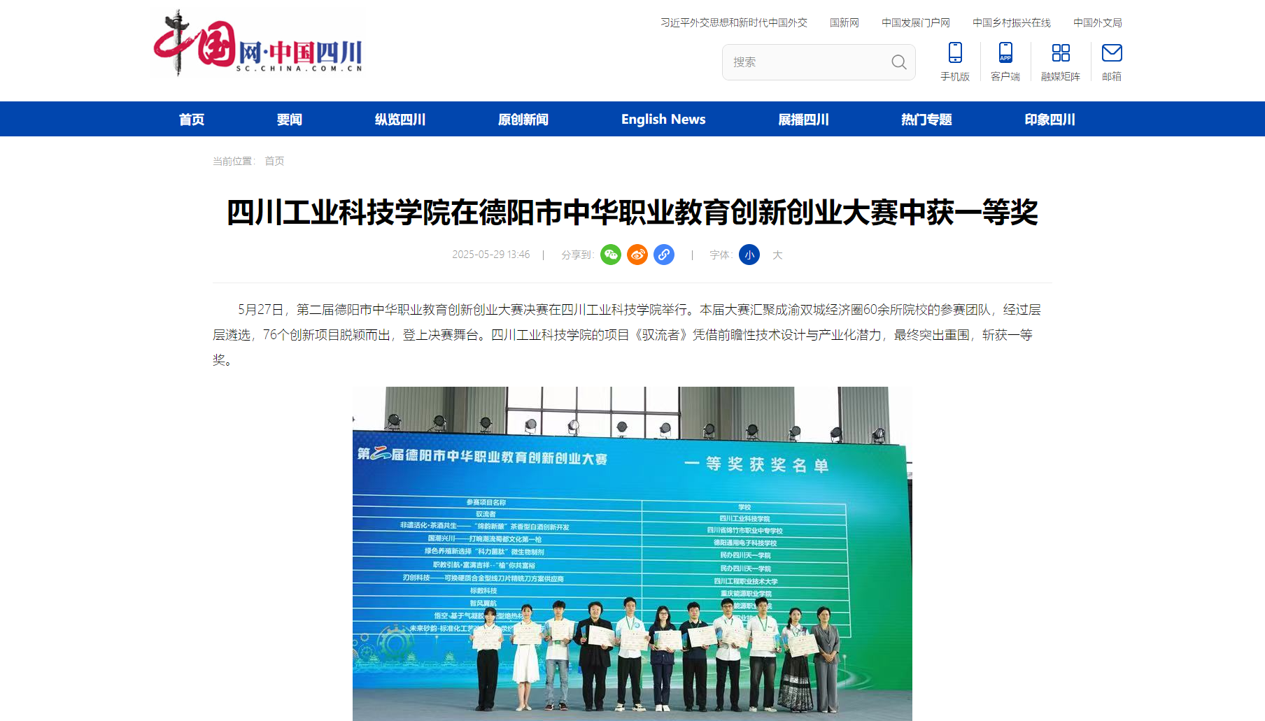 5月27日,第二届德阳市中华职业教育创新创业大赛决赛在四川工业科技学院举行。本届大赛汇聚成渝双城经济圈60余所院校的参赛团队,经过层层遴选,76个创新项目脱颖而出,登上决赛舞台。四川工业科技学院的项目《驭流者》凭借前瞻性技术设计与产业化潜力,最终突出重围,斩获一等奖。
