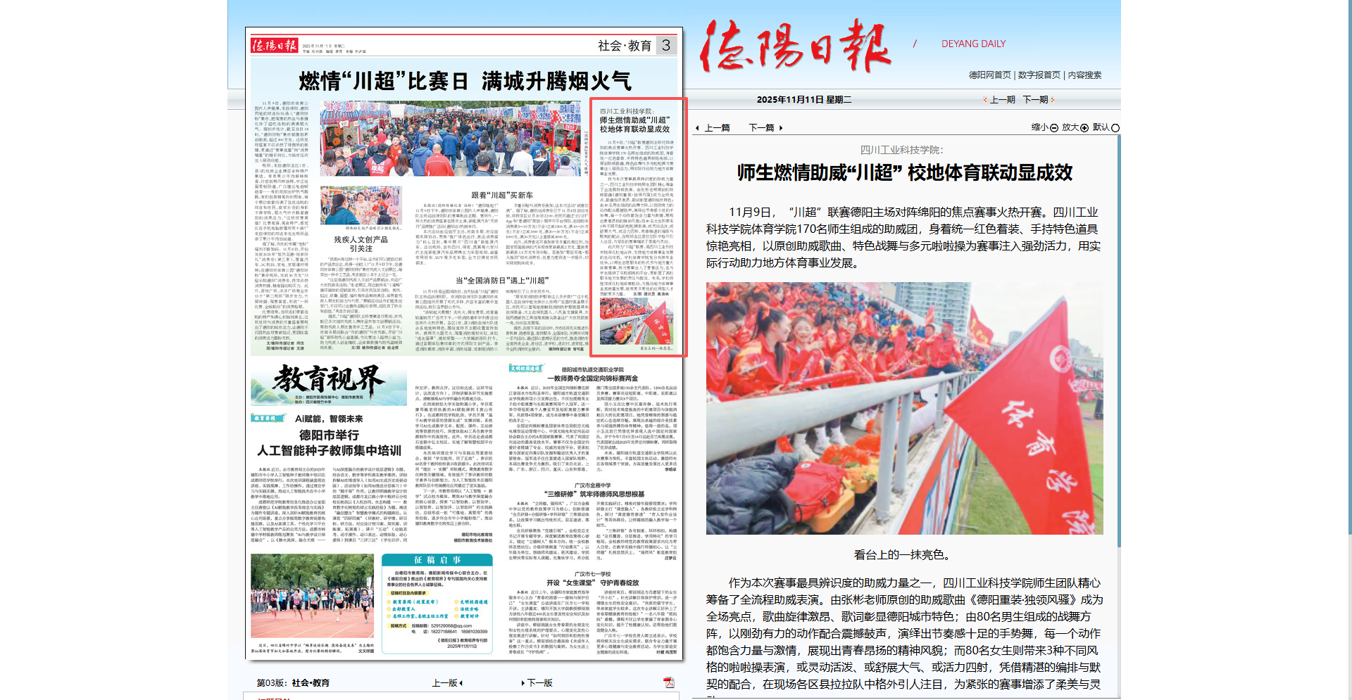 11月9日,“川超”联赛德阳主场对阵绵阳的焦点赛事火热开赛。四川工业科技学院体育学院170名师生组成的助威团,身着统一红色着装、手持特色道具惊艳亮相,以原创助威歌曲、特色战舞与多元啦啦操为赛事注入强劲活力,用实际行动助力地方体育事业发展。