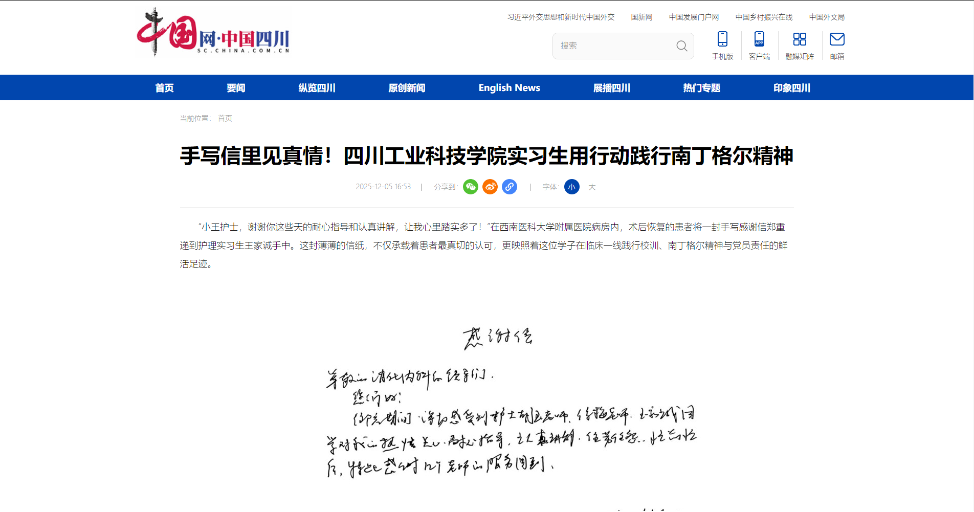 作为四川工业科技学院大健康学院的护理实习生,同时也是一名共产党员,王家诚始终以高标准严格要求自己,将初心使命融入临床护理的每一个细节。“学院教会我的不仅是护理技能,更是‘用心照护’的职业本色,三次见习经历让我懂得如何用专业践行这份初心。”即将担任实习队长的他表示,将带着学院的培养、见习的积累与患者的信任,继续跟着带教老师打磨专业能力,同时带领团队践行护理使命,把所学知识与职业精神融入每一次护理服务。