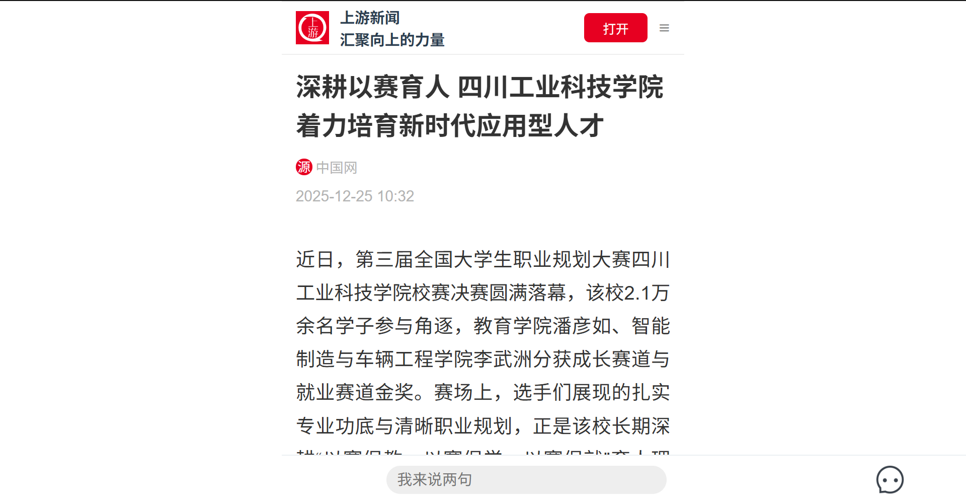 “面对当前就业形势,学校坚持以赛促教、以赛促学、以赛促就,将大赛作为推动生涯教育、提升就业质量的重要载体。”四川工业科技学院相关负责人表示,下一步,学校将继续以赛事为桥梁,深化理论与实践的融合、推动知识与技能的衔接,在深耕赛事育人的道路上持续探索创新,为培养更多具备创新精神、实践能力和社会责任感的新时代应用型人才筑牢根基,让青年学子在实践奋斗中绽放青春梦想。