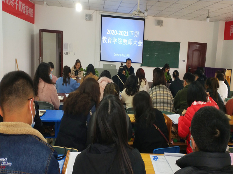 227日下午,教育学院在学前实训中心召开新学期教职工大会,会议由院长吴节义主持,学院党总支书记熊定永、副院长孙红英以及学院全体教职工参加了会议。