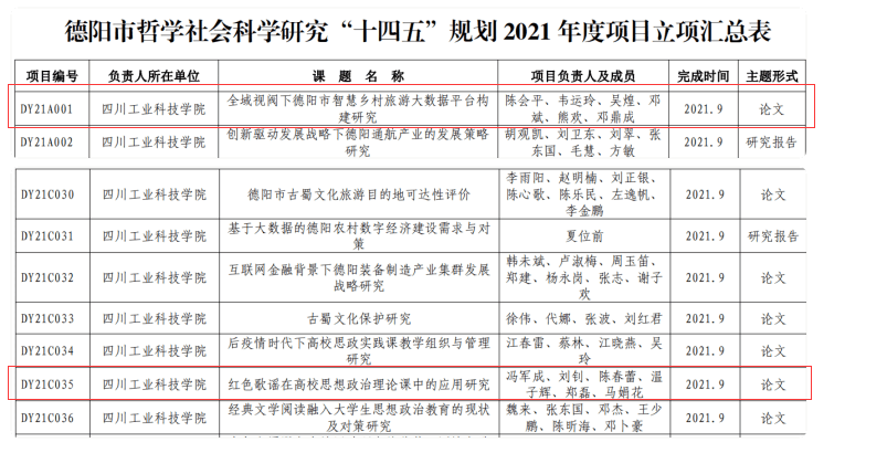 今日,德阳市哲学社会科学研究院公布了“十四五”规划2021年度项目立项名单,学校共9项立项,学院陈会平副教授申报的《全域视阀下德阳市智慧乡村旅游大数据平台构建研究》和冯军成老师申报的《红色歌谣在高校思想政治理论课中的应用研究》2个项目获批立项建设,其中陈会平副教授的项目作为重点项目。