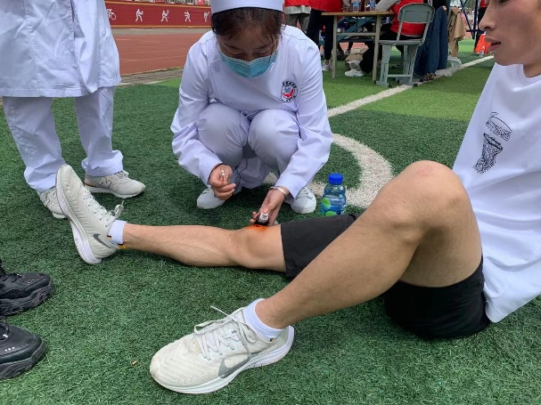 运动会期间,医务人员在赛场上随时关注运动员的身体状态,询问病情,监测生命体征,为受伤者清创、消毒,为肌肉痉挛者按摩放松,为晕厥学生放松心情,为身体不舒服者检查身体,用精湛的医术缓解运动员的伤痛,以热情的服务温暖运动员的心。他们工作认真、态度和蔼,不仅消除了运动员的伤痛,也给予了心理上的安慰,他们的工作获得了高度评价。特别是运动会期间天气阴晴变化大,医务人员坚守岗位,表现出崇高的职业素养和强烈的责任心。此次运动会,我院“青年志愿者”总共为100多名运动员进行了现场救治,大部分运动员经过现场处置及后续治疗后好转康复。运动会已圆满落幕,护理学院医疗服务小组以饱满的工作状态,为全校师生提供了高质量的现场医疗救护,得到了领导的一致好评,圆满完成了医疗应急保障工作。
