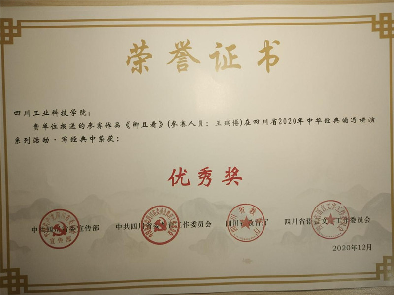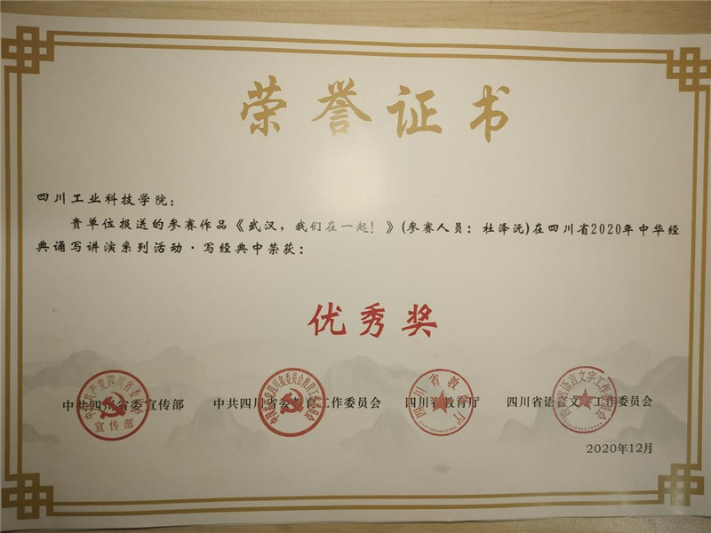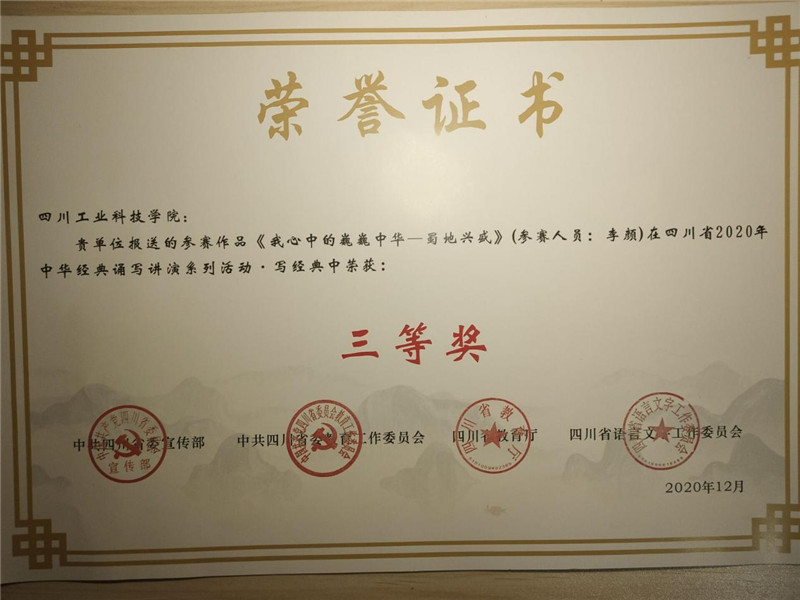 日前,学校师生在2020年中华经典诵写讲演系列活动中取得了优异成绩。其中,李颜凭借作品《我心中的巍巍中国—蜀地兴盛》荣获三等奖,杜泽沅的《武汉,我们在一起》,王瑞博的《卿且看》获得优秀奖。
