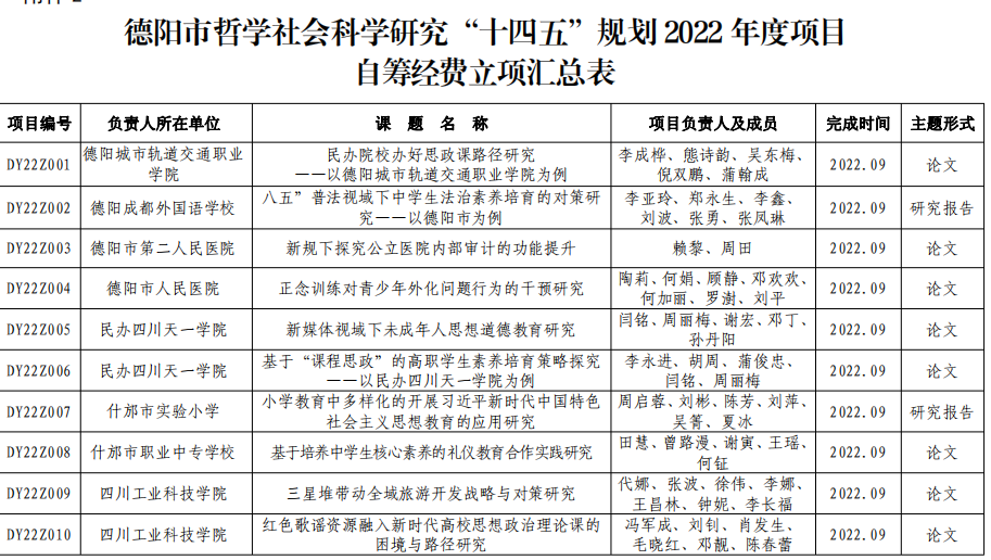 今日,德阳市社会科学界联合会公布了“十四五”规划2022年度项目立项名单,学院红色歌谣研究中心负责人冯军成老师申报的《红色歌谣资源融入新时代高校思想政治理论课的困境与路径研究》获批。