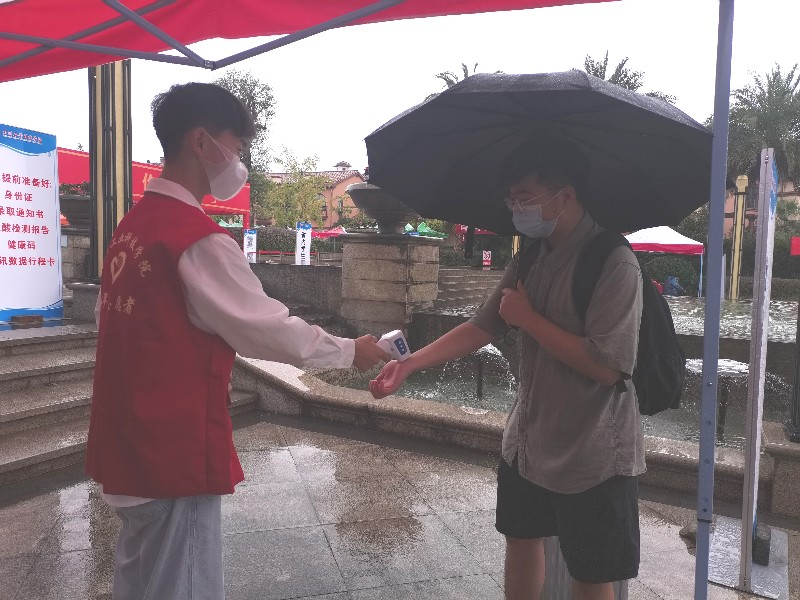 在学校迎新场地,最先映入眼帘的便是疫情防控工作专区,设有省内学生通道、省外学生通道、行李消毒区、体温测量区和信息登记区,同时学工部(处)安排专人负责学生防疫相关工作,做到迎新防疫措施科学化、精准化、人性化。前来报到的新生,在“红马甲”的协助下,先进入行李消毒区,给新生携带的行李进行全面消杀后,再进入体温检测区,待体温测量正常后,再进入信息登记区。学生志愿者严格按照省内外防疫要求,详尽查验核酸检测报告、健康码和通讯数据行程卡,完全符合防疫要求的新生方可进入报到场地。