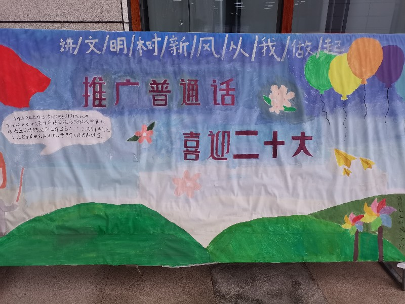 同时,各二级学院对照《学生工作部(处)2022推普周工作计划》,结合学院工作实际,绘制了喜闻乐见的“推广普通话,喜迎二十大”活动展板,并摆放在人流较多的龑江学村图书馆前,积极营造推普活动氛围、提升师生文明意识,形成人人学普通话、人人说普通话的良好语言环境,全面铸牢国家通用语言文字在促进各民族间无障碍交流的桥梁作用以及帮助个人成长成才的基础性作用。