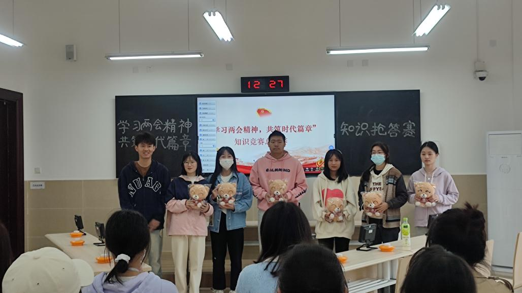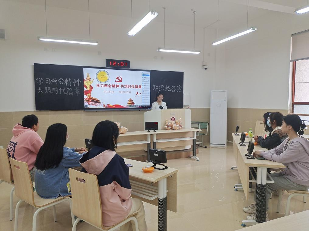 第一阶段为线上测试,借助易班优课平台开展,以学习2023年两会精神知识为主。活动分为五大板块的学习,同学们通过在线考试和课群,深刻领悟到“两会精神”以及当前国际国内新形势。线下活动分为知识竞赛和及抢答交流两部分,线上测试前50名的同学通过参与线下知识竞赛角逐出六名同学参与抢答比赛。交流分享及抢答环节分为上半场和下半场两部分,通过设置共答题、抢答题、加时赛和轮答赛来加强同学们对“两会精神”和时代新篇章的理解。抢答过程中,同学们积极参与,按下声旁的抢答器,回答出心中的答案,主动分享交流自己的学习感悟,表达出对国家的历史使命感和社会责任感。