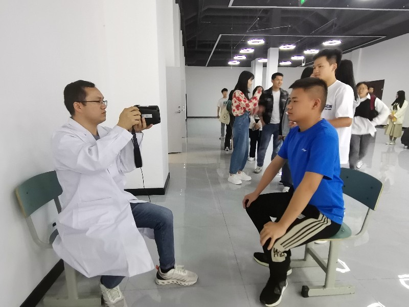 在课间空闲时间,学生们纷纷前来进行眼健康问诊,瞬间出结果的视力筛查仪深受学生欢迎,不仅可以快速精准检测裸眼近视和散光情况,而且激发起学子们对科技知识的求知欲和关注度。裂隙灯显微镜前也是人头攒动,医生给前来问诊的师生详尽检查眼睑、结膜、角膜、虹膜、前房、晶体等眼表及眼前节有无异常,并耐心解答师生提出的相关护眼问题。