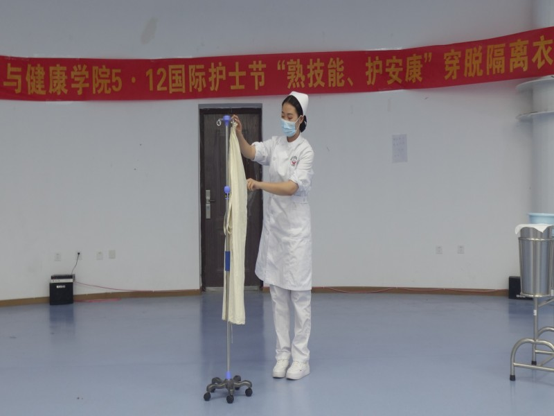 在“5.12”国际护士节来临之际,为加强护理专业学生技能教育,巩固标准隔离衣的穿脱流程,夯实掌握操作技能,强化全体护理专业学生的感染防控意识。4月18日下午,体育与健康学院在东区圆二实训室组织开展了“熟技能 护安康”穿脱隔离衣技能大赛。本次大赛由刘梓婧同学主持,副院长刘琼碧、白诗怡老师和顾茜老师担任评委,李海萍、徐文丽等12名同学从初赛中脱颖而出进入决赛。