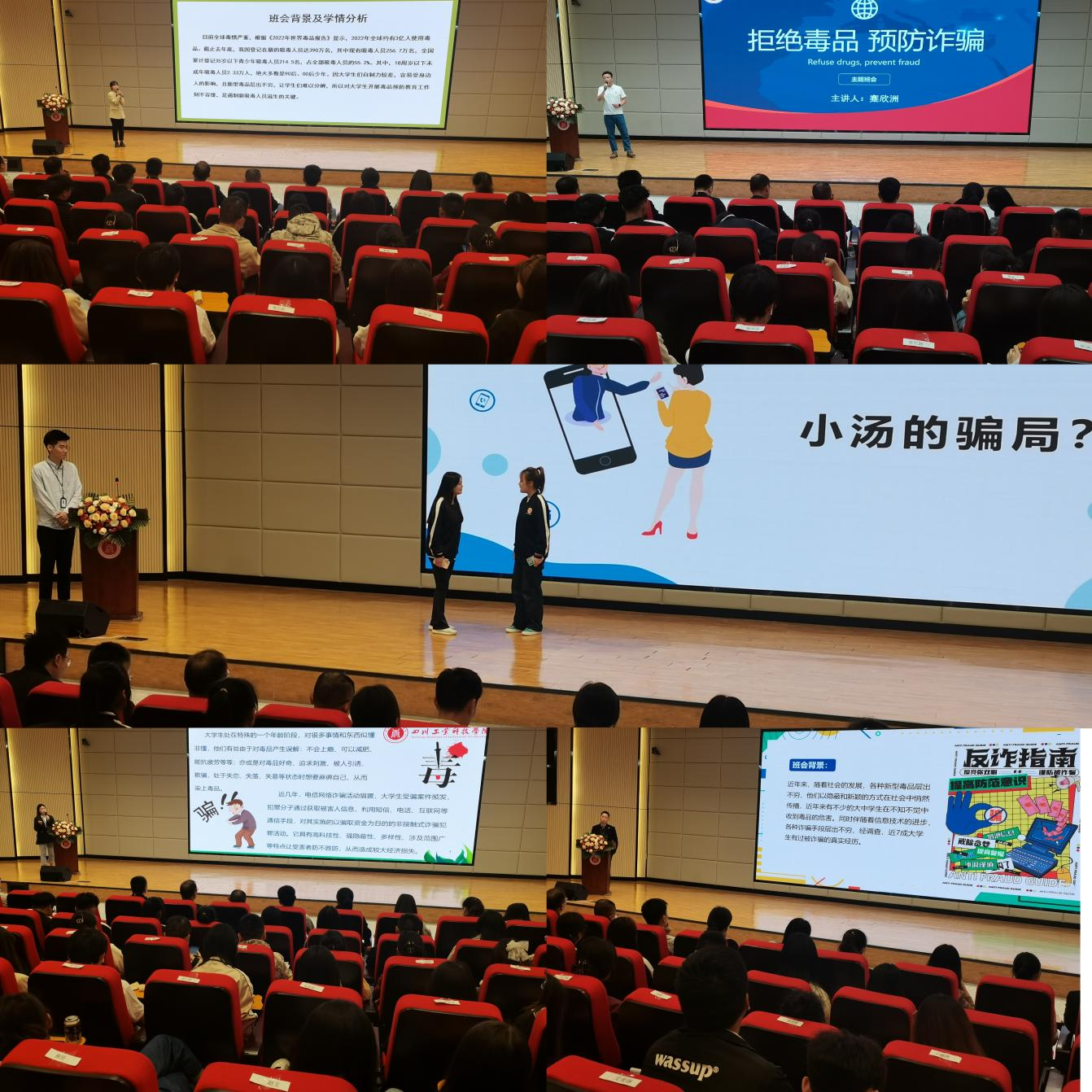 主题班会环节,参赛辅导员围绕既定的“拒绝毒品 预防诈骗”班会主题,结合学生实际,借助PPT展示,通过情景剧模拟演示、主题班会说课、师生互动学习、警示教育宣传等丰富多彩的形式,深入剖析电信诈骗和吸食毒品的巨大危害,多角度阐释远离毒品和预防诈骗的重要意义,充分展现了辅导员深厚的理论功底和务实的工作作风,同时也给观摩师生带来了一堂精彩纷呈的拒毒防诈宣讲课,阵阵掌声响彻赛场。