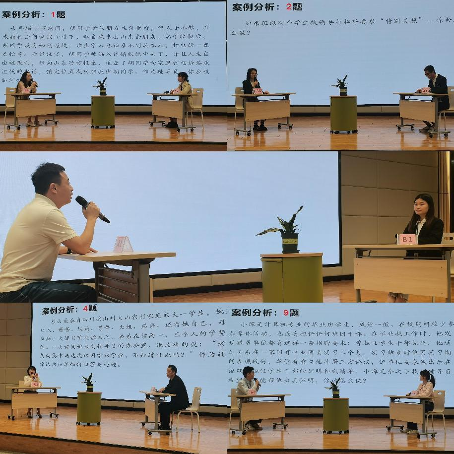 案例分析环节,紧扣高校辅导员工作实际,突出学生服务工作中心,以“你提问、我回答”的方式展开。参赛辅导员分AB角互提互答,综合运用心理学、教育学、管理学等多学科知识,对所选案例认真分析、理清思路、灵活应答、举措得当,充分彰显了新时代高校辅导员较强的应急处理能力和丰富的理论知识储备。