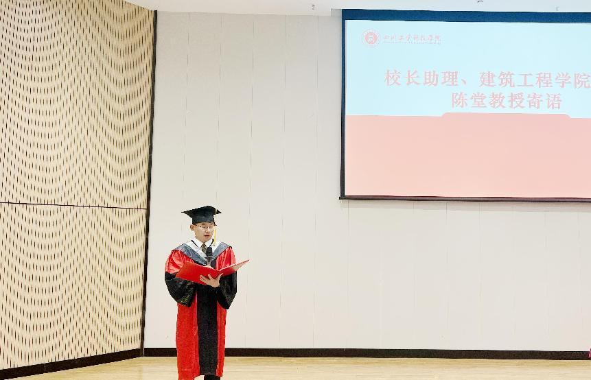 毕业典礼在庄严的国歌声中拉开序幕。副院长孙芙蓉宣读建筑工程学院2023届获得学士学位的毕业生名单和获得省级优秀毕业生名单,校长助理、学院院长陈堂为省级优秀毕业生代表颁发证书。