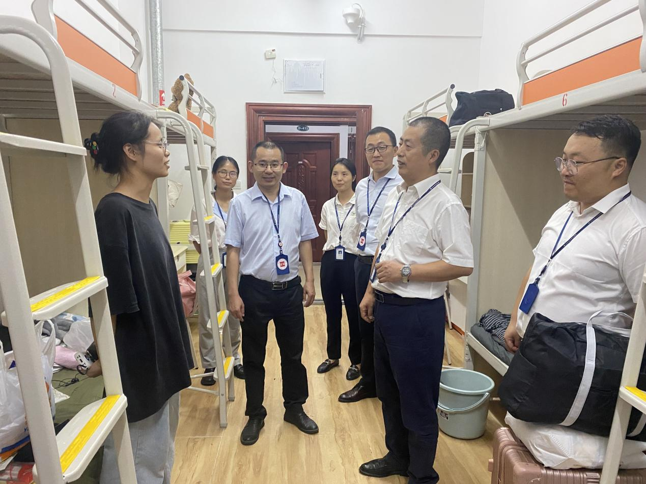张继华书记与学生亲切交流,细心了解学生基本情况,询问学生的入学事宜办理、宿舍入住、校园环境熟悉等情况,仔细地查看学生宿舍环境和水电设备运行情况,并亲切询问学生入学后的感受,对学生的专业情况进行了解。同时,他鼓励同学们尽快适应新环境、熟悉新同学,迅速进入新的学习状态,珍惜青春年华,做奋发有为的新时代青年。他还殷切嘱托学院教职工一定要做好新生入学教育工作部署,引导学生熟悉学校校史校情、规章制度,做好学习规划。特别强调新生班级辅导员一定要耐心细致,热情周到为学生做好学习和生活服务,加强师生交流沟通,提升学生的归属感。