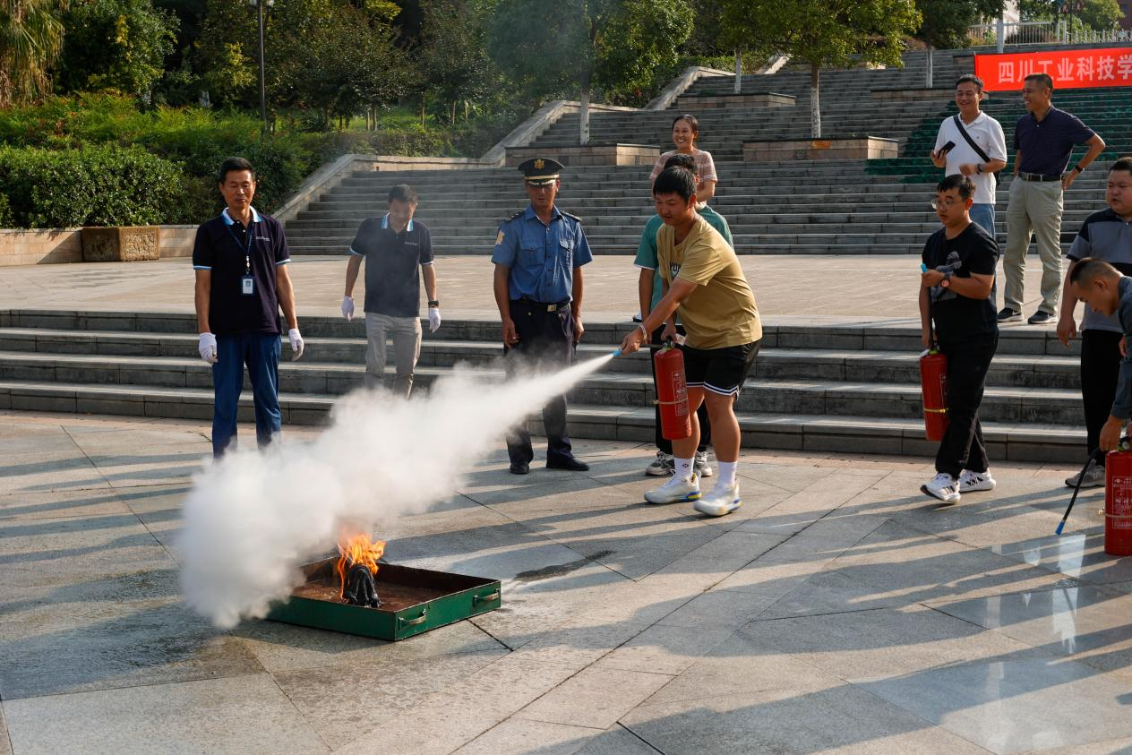 下午4:30演练正式开始。本次演练模拟实训中心各实训室起火,烟雾触发感烟探测器报警,随着警报声响起,消防广播启动,同学们按照疏散演练方案,用手捂住口鼻,在现场人员指引下,低姿态就近从疏散通道疏散至五星广场,整个演练过程规范、有序、顺畅。疏散演练完毕后,参加演练学生有序进行灭火器使用培训,手执灭火器进行灭火操作体验。