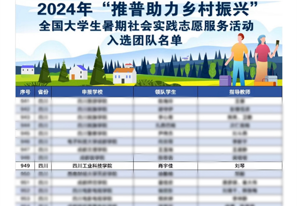 学校积极响应教育部语言文字应用管理司、共青团中央青年发展部号召,近日,由学校教育学院语委办刘琴老师指导、肖宇佳同学领队的四川工业科技学院赴青海门源回族自治县、玉树县推普助力乡村振兴服务队团队成功入选2024年“推普助力乡村振兴”全国大学生暑期社会实践志愿服务活动团队。