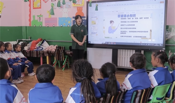 次日,一场别开生面的普通话拓展小课堂在代格村幼儿园拉开了帷幕。志愿者们精心准备了教学内容,以“书同文,语同音,人同心”为主题,用生动有趣的方式引导孩子们学习普通话。从基础的拼音发音到简单的日常对话,志愿者们耐心指导,循循善诱,让孩子们在轻松愉快的氛围中感受到了普通话的魅力。孩子们的眼神中闪烁着好奇与兴奋的光芒,他们跟着志愿者的节奏,大声朗读、积极互动,整个教室充满了欢声笑语。