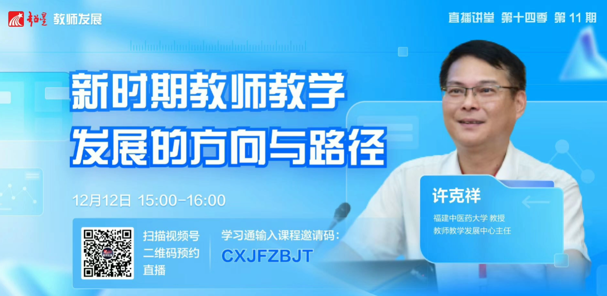 12月12日下午,教务处教师发展中心组织了全校无课教师参加超星教师发展直播讲堂第十四季第11期的活动。本期讲堂特邀福建中医药大学教授许克祥,就“新时期教师教学发展的方向和路径”这一主题进行主旨汇报。