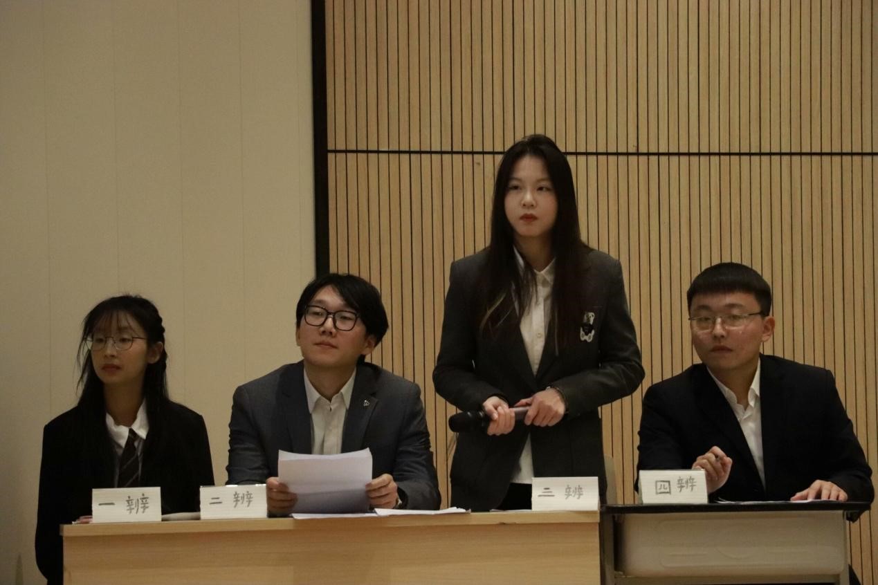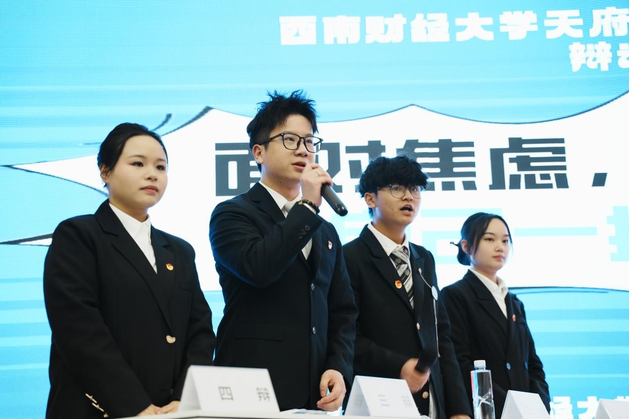 12月12日,在西南财经大学天府学院的C203教室里,另一场以“思辨风华,财科双星”为名的辩论表演赛也如期上演。本场比赛的辩题为“面对焦虑,年轻人应该逼自己一把还是放自己一马”。四川工业科技学院的正方与西南财经大学天府学院的反方再次上演了一场思维的碰撞。正方辩手袁倩、陈宇翔、曾烈池、彭雪以激昂的言辞和坚定的立场,表达了年轻人应该逼自己一把的观点;反方辩手郭涵、金琛杰、余政达、朱昱成则以其温婉的语调和深刻的思考,为放自己一马辩护。双方辩手在各个环节中均表现出色,他们的精彩表现不仅赢得了评委的认可,也让观众深受启发。