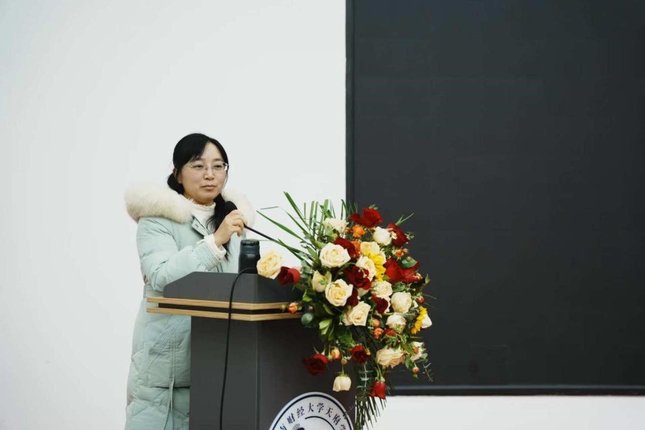 比赛结束后,西南财经大学天府学院的秦陈荣老师作为评委代表发表了讲话。她首先对两校辩手的精彩表现给予了高度评价,认为他们在比赛中展现出了出色的思维能力和辩论技巧。同时,她也对两校在加强合作交流、共同提升学生语言思辨能力方面所做的努力表示赞赏,并希望未来能有更多这样的活动举办。