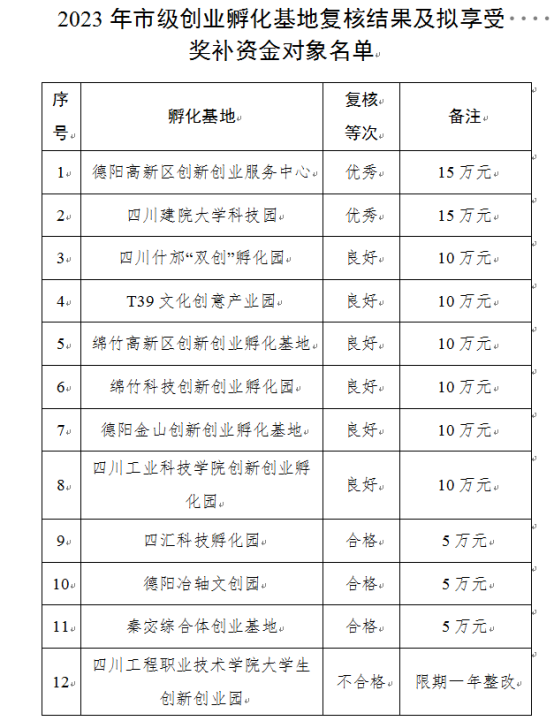 根据《德阳市人力资源和社会保障局关于2023年市级创业孵化基地复核结果及拟享受奖补资金对象的公示》文件规定,市人社局等5部门共同开展了2023年市级创业孵化基地复核评审,我校创新创业孵化园等级被评定为良好,荣获10万元的补助。