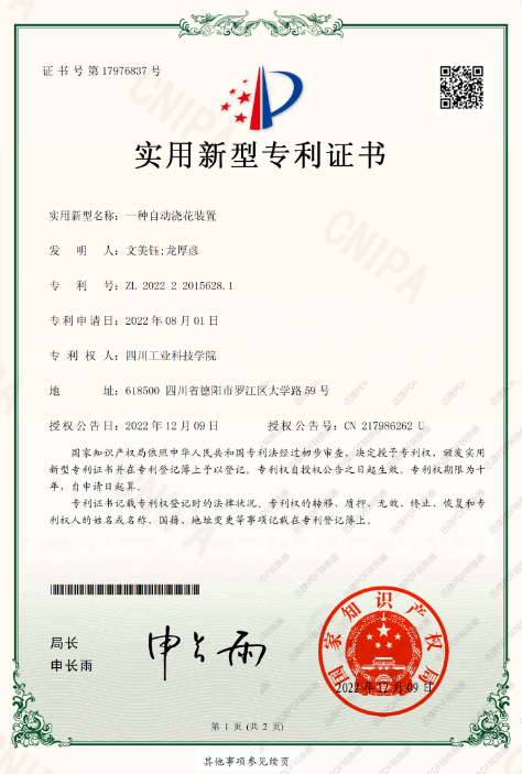 一种自动浇花装置-文美钰-实用新型专利证书