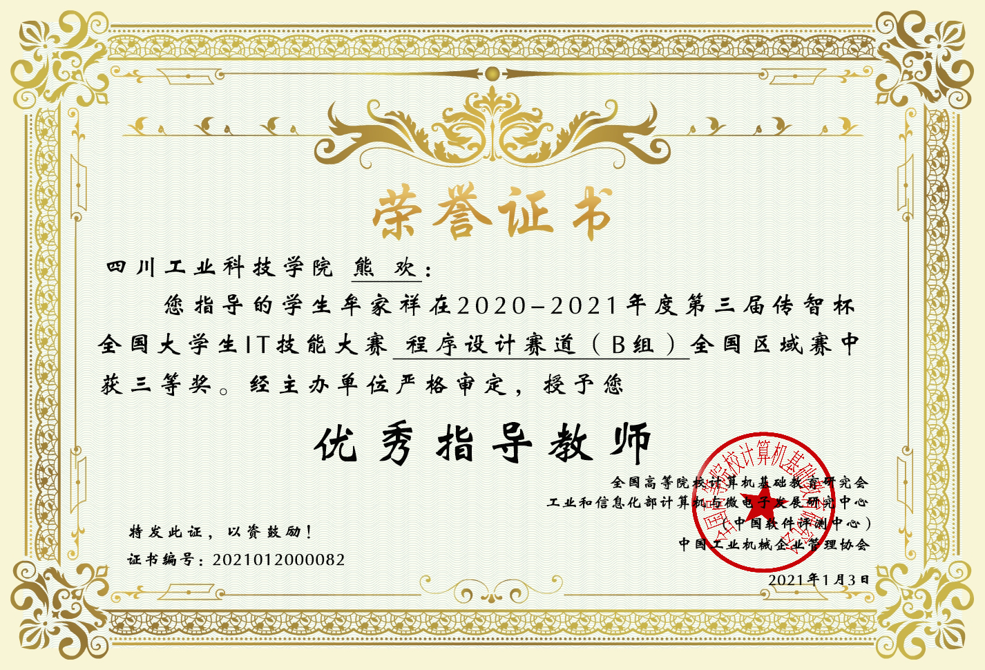 近日,我院教师陈会平、熊欢、吴煌、邓斌在2020-2021年度第三届传智杯全国大学生IT技能大赛程序设计赛道B组全国区域赛中指导学生荣获6个三等奖,28个优秀奖,经主办单位严格审核,被授予“优秀指导教师”。