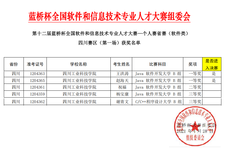 4月28日,蓝桥杯全国软件和信息技术专业人才大赛组委会公布了“第十二届蓝桥杯全国软件和信息技术专业人才大赛 — 个人赛省赛(软件类)”四川赛区(第一场)获奖名单,本次赛事电子信息与计算机工程学院选派王洪涛、祝福等11名学子参加,获得一等奖、二等奖各一项,三等奖两项;王洪涛同学和另一名校友参加全国总决赛。
