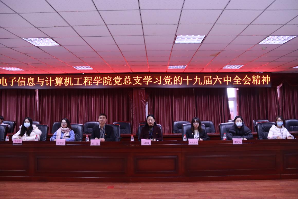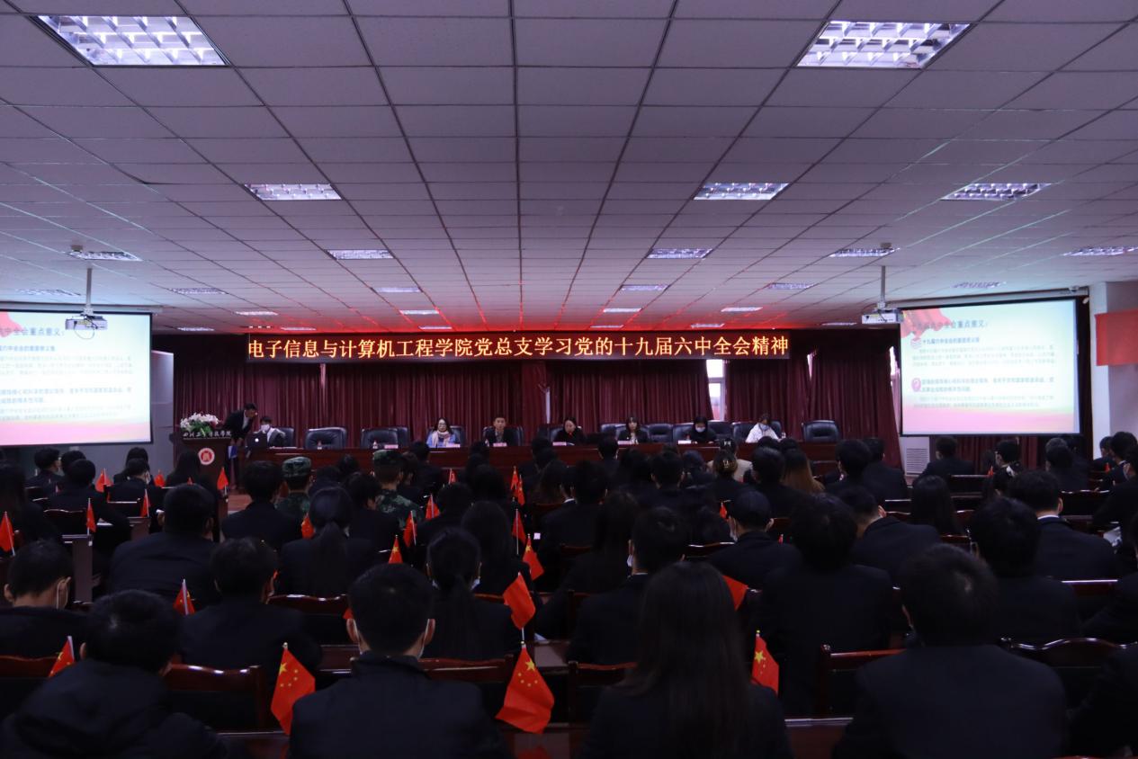 中共十九届六中全会是在我国发展的重要历史节点召开的一次具有全局性、历史性意义的重要会议,11月26日中午,电子信息与计算机工程学院党总支于图书馆D08组织我院正式党员、入党积极分子和团总支学生会全体学生干部对十九届六中全会重大精神进行学习。