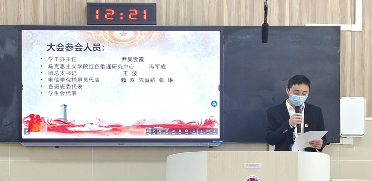会议便在共青团团歌中展开。学工办主任尹昊雯霞老师就我院学风建设工作再次部署,在强调学院加强学风建设必要性的同时,也强调了学生安全注意事项;马克思主义学院红色歌谣研究中心冯军成老师为同学们带来了开学第一堂团课;团总支学生会代表朱乾发和学生干部代表彭琳就团风、学风建设发言,号召大家积极学习团的有关知识,加强自身道德修养,做一位合格的学生干部。