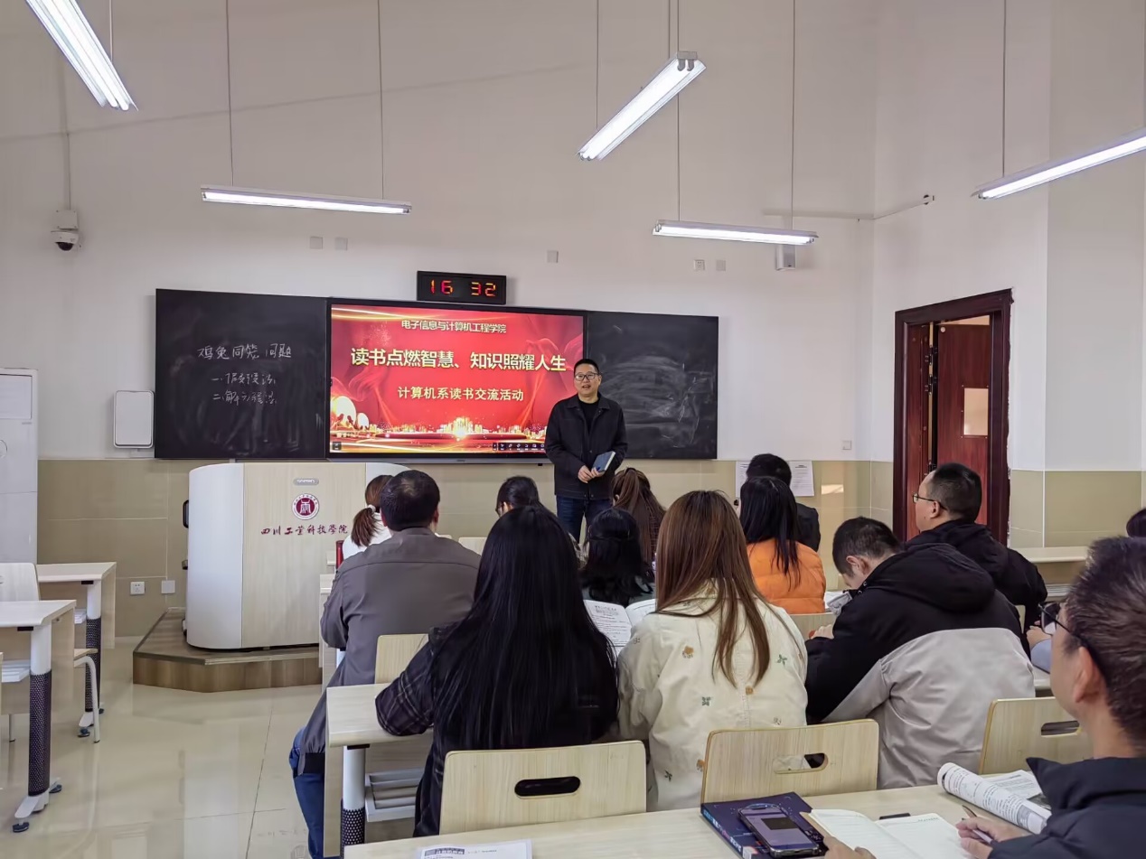 为了响应学校“行为示范、书香校园”教师读书活动,电子信息与计算机工程学院计算机系于2023年11月16日下午在教学楼B501教室开展了“读书点燃智慧、知识照耀人生”主题的读书交流活动。本次活动由计算机系主任陈会平主持,全体计算机系教师参加。