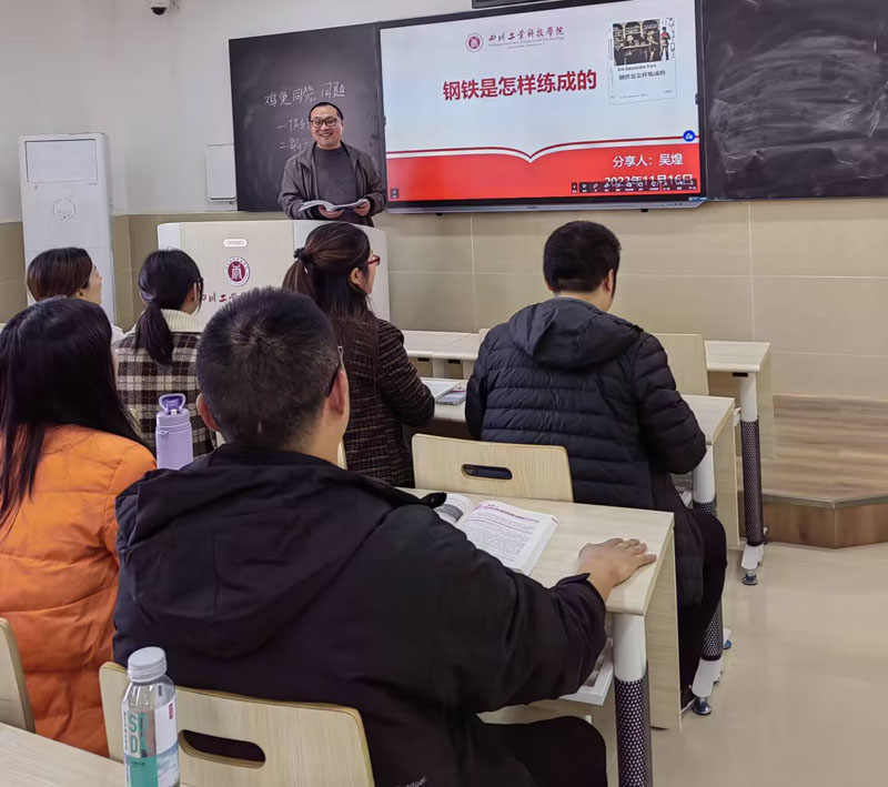 本次活动计算机系教师吴煌和曾英两位老师分别分享了《钢铁是怎样练成的》和《教师的德艺双馨之路》两本书。吴煌老师从《钢铁是怎样练成的》一书中汲取了革命精神和奋斗意志,分享了自己在教学和科研中遇到的困难和挑战,以及如何克服和解决的经验和方法。吴煌老师说,他从小就喜欢读《钢铁是怎样练成的》,这本书对他的人生观和价值观有着深刻的影响。书中的主人公保尔·柯察金是一个坚强的革命者,他在艰苦的环境中不断地学习和成长,最终成为一名优秀的共产党员和钢铁工人。他说,在教学和科研中他也遇到过很多困难和挫折,但他从来没有放弃过,而是向保尔·柯察金学习,用革命精神和奋斗意志去克服和战胜。吴煌老师还结合自己的教学实践,讲述了如何将书中的思想和精神融入到课程教学中,激发学生的学习热情和创新能力。