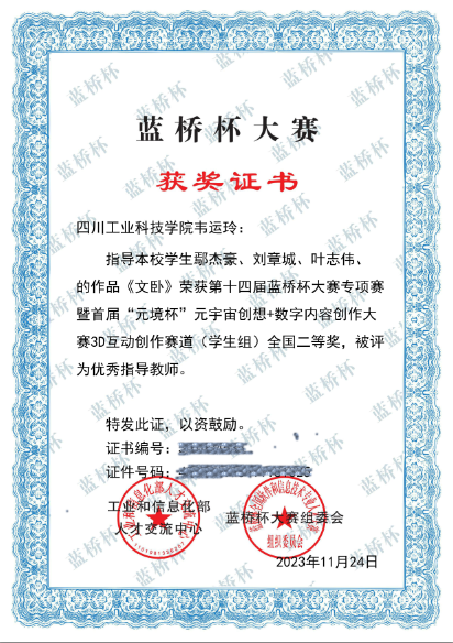 由工业和信息化部人才交流中心和重庆市璧山区政府联合主办的第十四届蓝桥杯大赛专项赛暨首届元境杯元宇宙创想+数字内容创作大赛评审结果公布,由电子信息与计算机工程学院韦运玲老师指导的鄢杰豪、刘章城、叶志伟3位同学的作品《文卧》荣获3D互动创作赛道(学生组)全国二等奖,韦运玲被评为优秀指导教师。