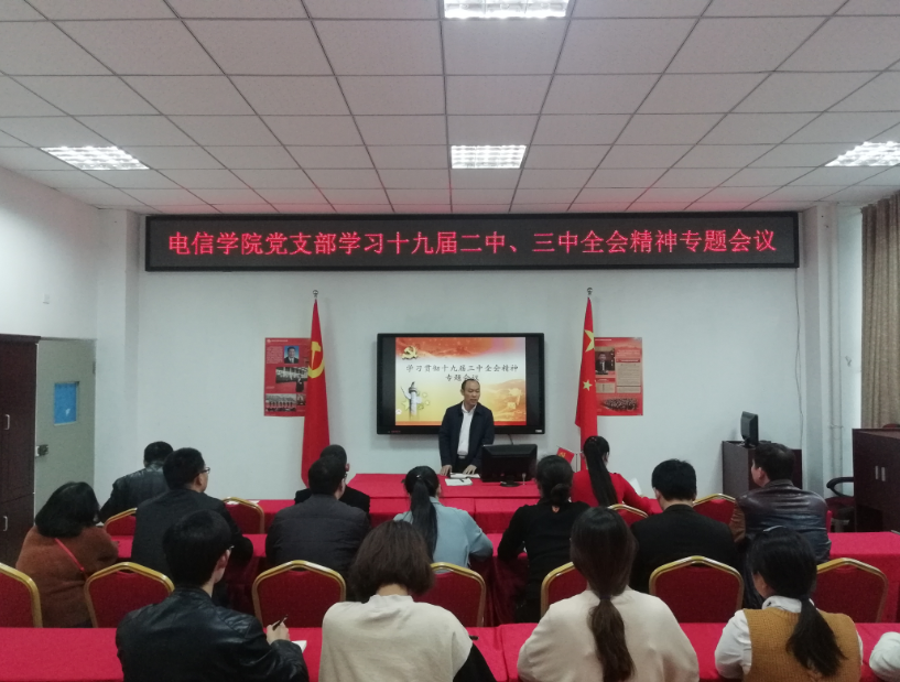 电子信息工程学院党支部书记陈亨贵组织参会人员学习党的十九届二中、三中全会精神