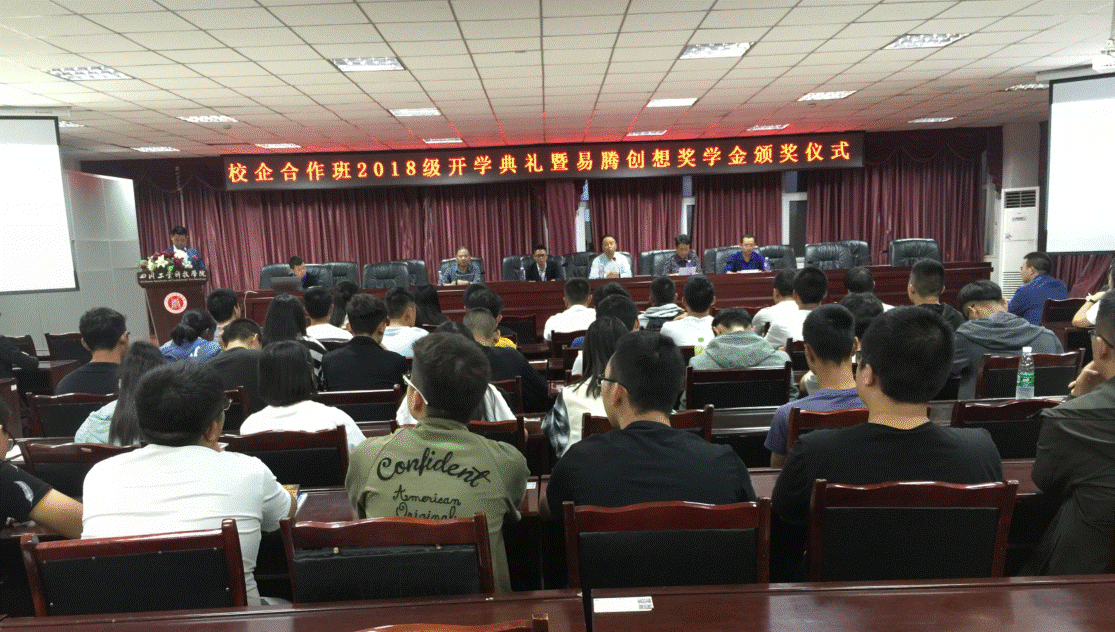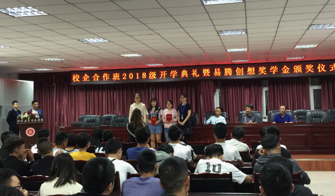 9月28日晚,电子信息与计算机工程学院“易腾创想”校企合作班2018级开学典礼暨“易腾创想”奖学金颁奖仪式在图书馆408会议室隆重举行。四川芙铭实业有限责任公司常务副总经理、学校理事会办公室主任何义兴,学校副校长郭桂萍,教务处处长杨珂,电子信息与计算机工程学院党支部书记、院长龙厚彦,易腾创想智能科技有限公司6位企业代表出席颁奖仪式,“易腾创想”校企合作班2017、2018级全体学生参加了颁奖仪式。本次活动由龙厚彦主持。