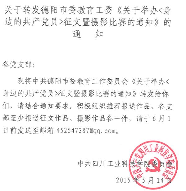 关于转发德阳市委教育工委《关于举办<身边的共产党员>征文暨摄影比赛的通知》的通知