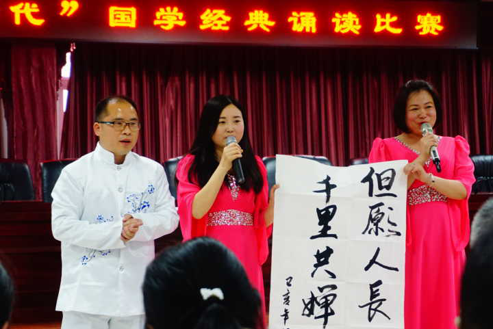 比赛中,老师们个个精神饱满、举止大方、激情高昂,以朗读、诵唱、表演等各种形式诠释经典,比赛现场弥漫着浓重的国学氛围,经典的思想精髓犹如润物细无声的春雨,荡涤着师生的心灵。有管理学院工会小组带来的《将进酒-满江红*写怀》,机关二支部工会小组带来的《登峰揽胜》,更有教育学院工会小组带来的《水调歌头》,护理学院工会小组带来的《关雎+蒹葭》,还有如《春江花月夜》、《爱莲说》、《道德经》、《雨霖铃》等优美却不失典雅的国学经典。经过激烈的比拼,护理学院工会小组的老师们身着旗袍,袅袅娉婷,以优雅唯美的颂唱引人入胜,最终拔得头筹。