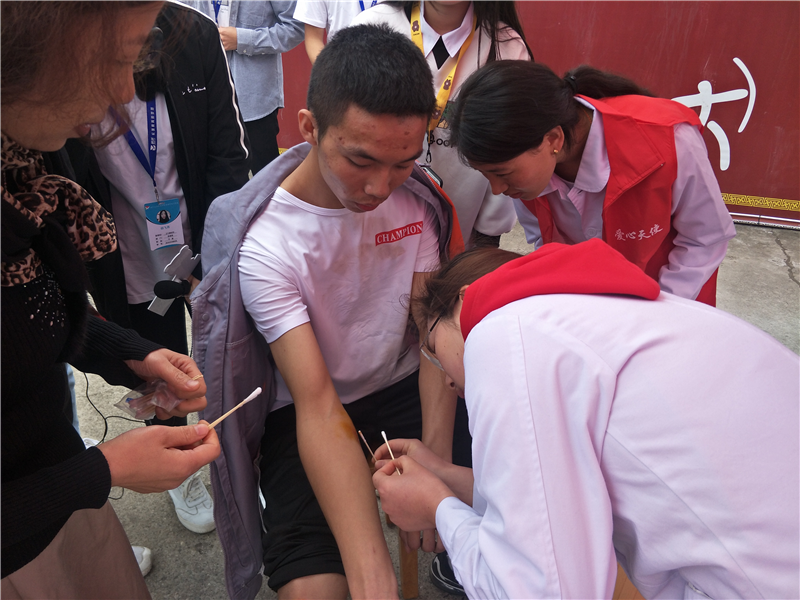 在运动会期间,医疗服务队志愿者在运动场内专设应急救助点,义务为运动员们提供医疗急救服务。志愿者们利用所学专业知识,行走在运动场的四周,密切关注着每一位运动员的状况,及时地为前来诊治的每位受伤运动员进行诊查和治疗,并给予他们贴心诚挚的安慰和鼓励。护理学院医疗服务队以专业的技术、热情的态度,赢得了广大师生的一致好评,成为了赛场上一道亮丽的风景线。