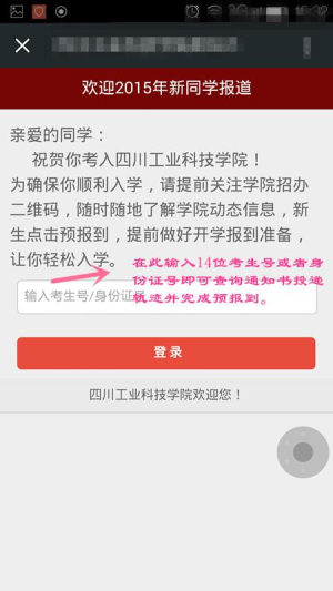 2、进入学院官方微信,点击“玩转工科”——“新生专区”——点击2015迎新(输入14位考生号或身份证号)即可登录预报道及查询录取通知书投递轨迹。