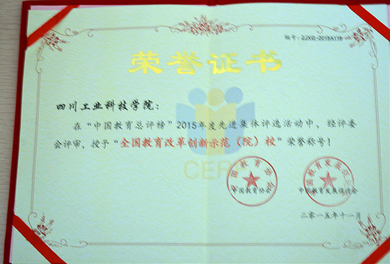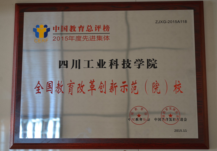 经评审,我校在“中国教育总评榜”2015年先进集体评选活动中获得“全国教育改革创新示范(院)校”荣誉称号。