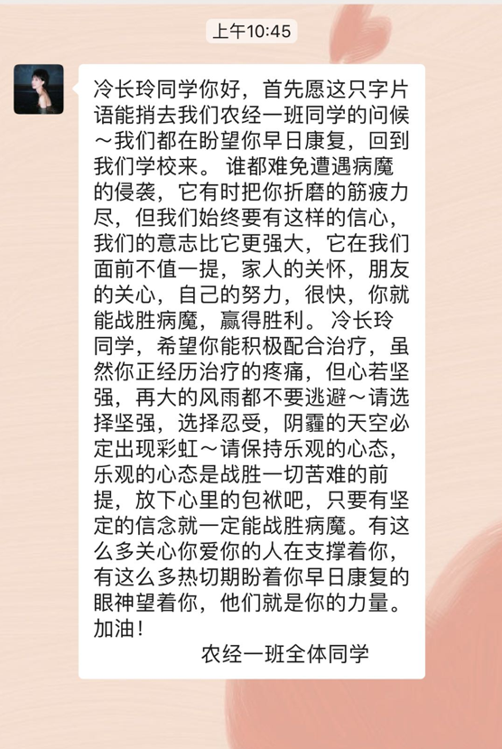 冷长玲同学曾是学校学生会的一员,因其工作认真仔细,时常得到老师和同学的赞扬。同学们眼中的冷长玲是一个生活简朴、学习刻苦、值得信赖的好同学,老师们眼中的冷长玲是一个品学兼优、积极乐观的好学生。可是,病魔的突然来袭,给予了她沉重的打击,让本就贫困的家庭雪上加霜,但是我们相信在冷长玲同学的坚强乐观下,在全校师生的全力帮助下,上天一定会眷顾她,让她早日康复,重回校园。就如她所在班群里“加油加油”的刷屏那样充满希望和力量,就像同学院2018级农业经济与管理1班全体同学写给她的信上说的那样“虽然,你正遭受病魔的侵袭,经历治疗的疼痛,但心若坚强,再大的风雨都不会把你摧垮,阴霾的天空必定出现彩虹,有这么多关心你爱你的人在支撑着你,有这么多热切期盼你早日康复的眼神给予你信心,这就是你的力量,加油,我们都等着你回来!”